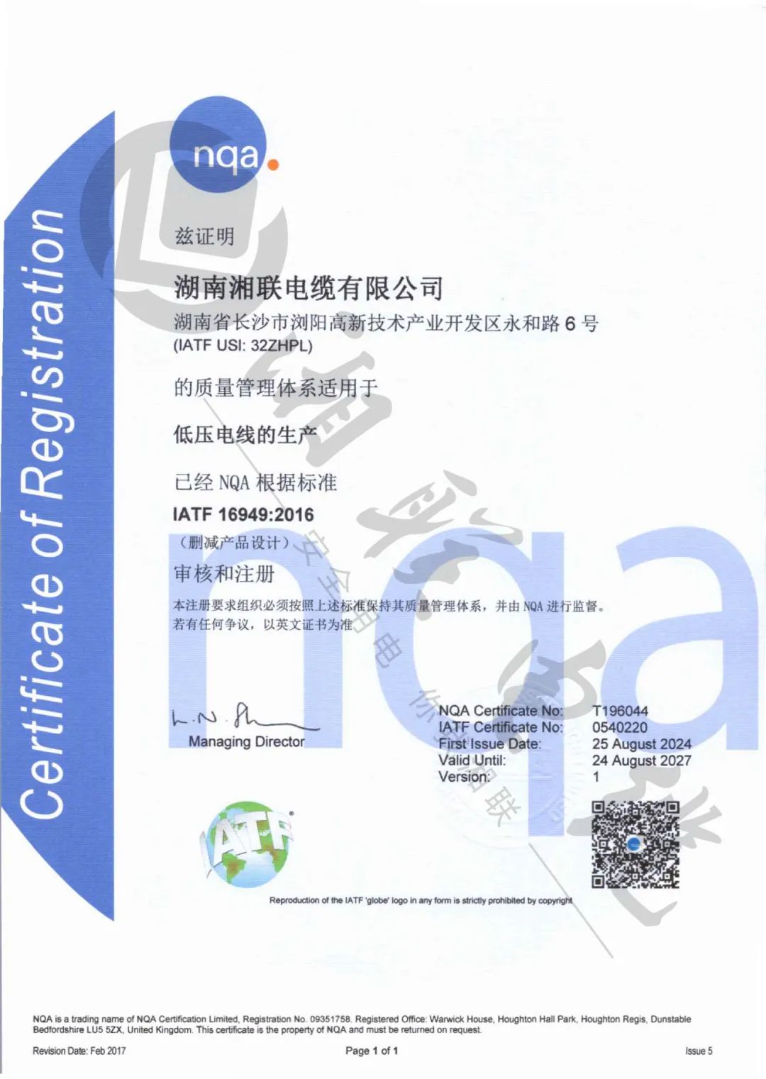 湘聯(lián)電纜通過IATF16949質(zhì)量管理體系認(rèn)證!