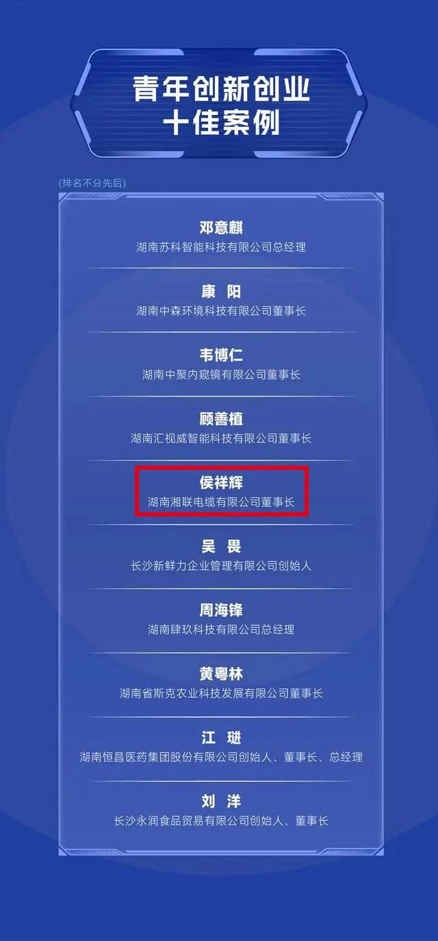 活動現(xiàn)場,發(fā)布了發(fā)展新質(zhì)生產(chǎn)力十佳案例、青年創(chuàng)新創(chuàng)業(yè)十佳案例、優(yōu)化營商環(huán)境十佳案例3張榜單,湘聯(lián)電纜董事長侯祥輝光榮上榜青年創(chuàng)新創(chuàng)業(yè)十佳案例。
