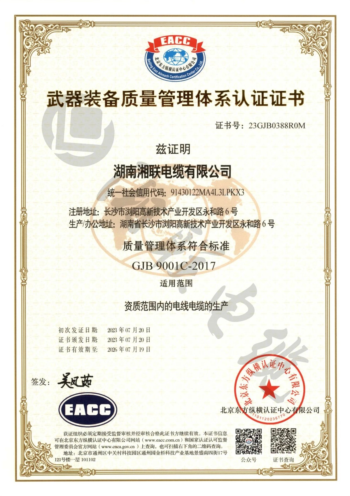 2023年,湘聯電纜順利通過國軍標質量管理體系認證,獲得《武器裝備質量管理體系認證證書》,質量管理體系符合:GJB9001C-2017標準,這表明湘聯電纜的質量管理體系符合武器裝備質量管理體系的標準及相關要求,具備軍品研發、生產和服務的質量管理能力。
